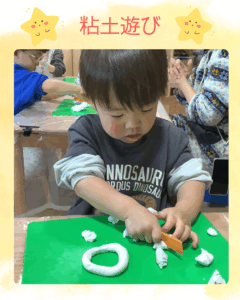 粘土遊びをしました。 丸めたりちぎったり、いろんな形に大変身✨ ドーナツやお豆やアイス、、、食べ物が大人気です😆