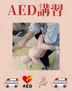 消防隊員の方に来て頂き、AEDの使い方と心肺蘇生法、異物が詰まった時の対応などを教えて頂きました。全職員で緊急時の再確認ができました。