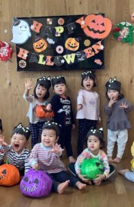 制作した可愛い黒猫の帽子をかぶって体操やピニャータでパーティーを楽しんだ後、お散歩に行き地域の方々からたくさんのお菓子をいただきました🍪